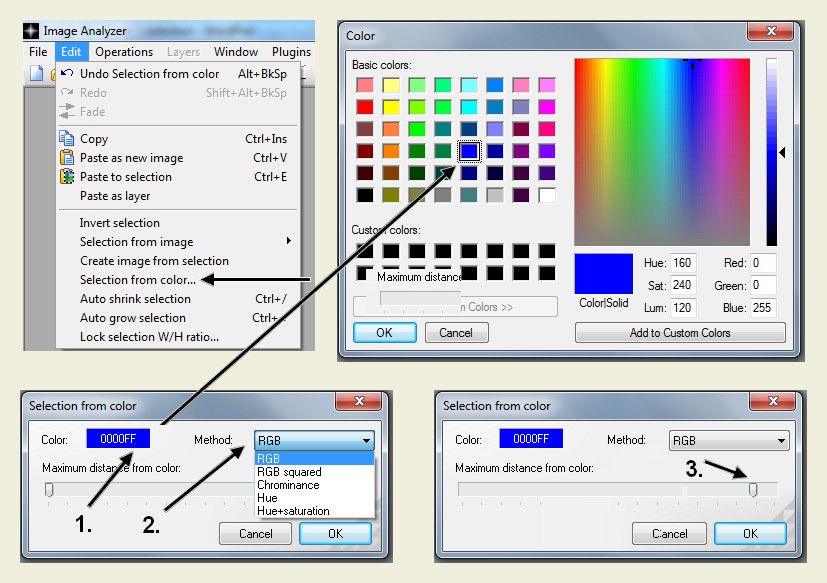 Image Analyzer provides three selection tools to select limited parts of an image for special treatment. When a selection is active, filter effects and adjustments are applied only to the selected areas. Rectangular selections also allow you to crop to your selection (Alt-C), copy your selection (Ctrl-C), or to paste the Windows clipboard to your selection (Ctrl-E).