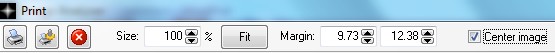 Lastly, before you print you image, you must set the size. Click on the up or down arrows to change the print size. The printed area in relation to the paper will be shown in blue against a white background and will be indicated in centimeters. Refer to the table above for equivalents in inches for the sizes that are tabulated. You can also click the Fit button to get the maximum size print for your paper.