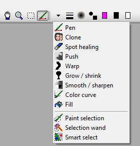 In addition to rectangular selections, there are three mask selection tools available from the tool bar. Two of them are discussed here. These are Paint selection and the Selection wand. The Paint selection tool is a brush, so you may set the size (in pixels) and shape (round or square). Hold down the left mouse button and drag the mouse to paint your selection freehand. Do the same with the right mouse button to remove portions of the selection. By going to the Edit menu you may invert a painted selection.